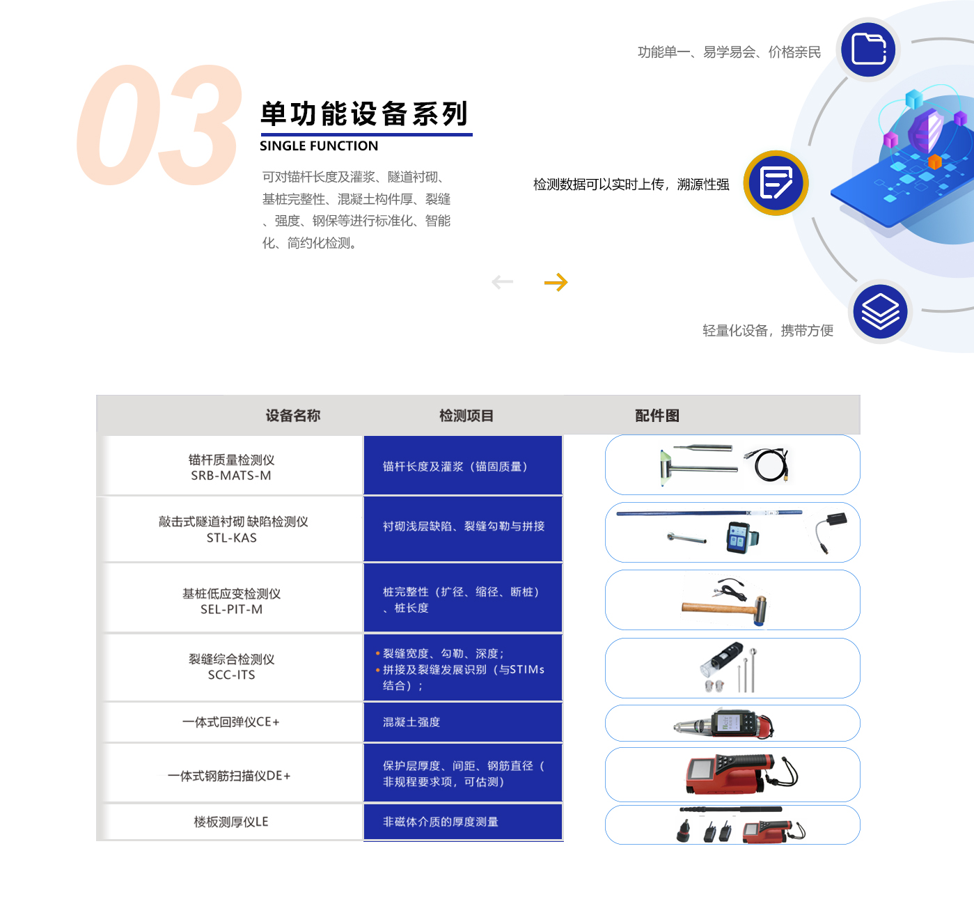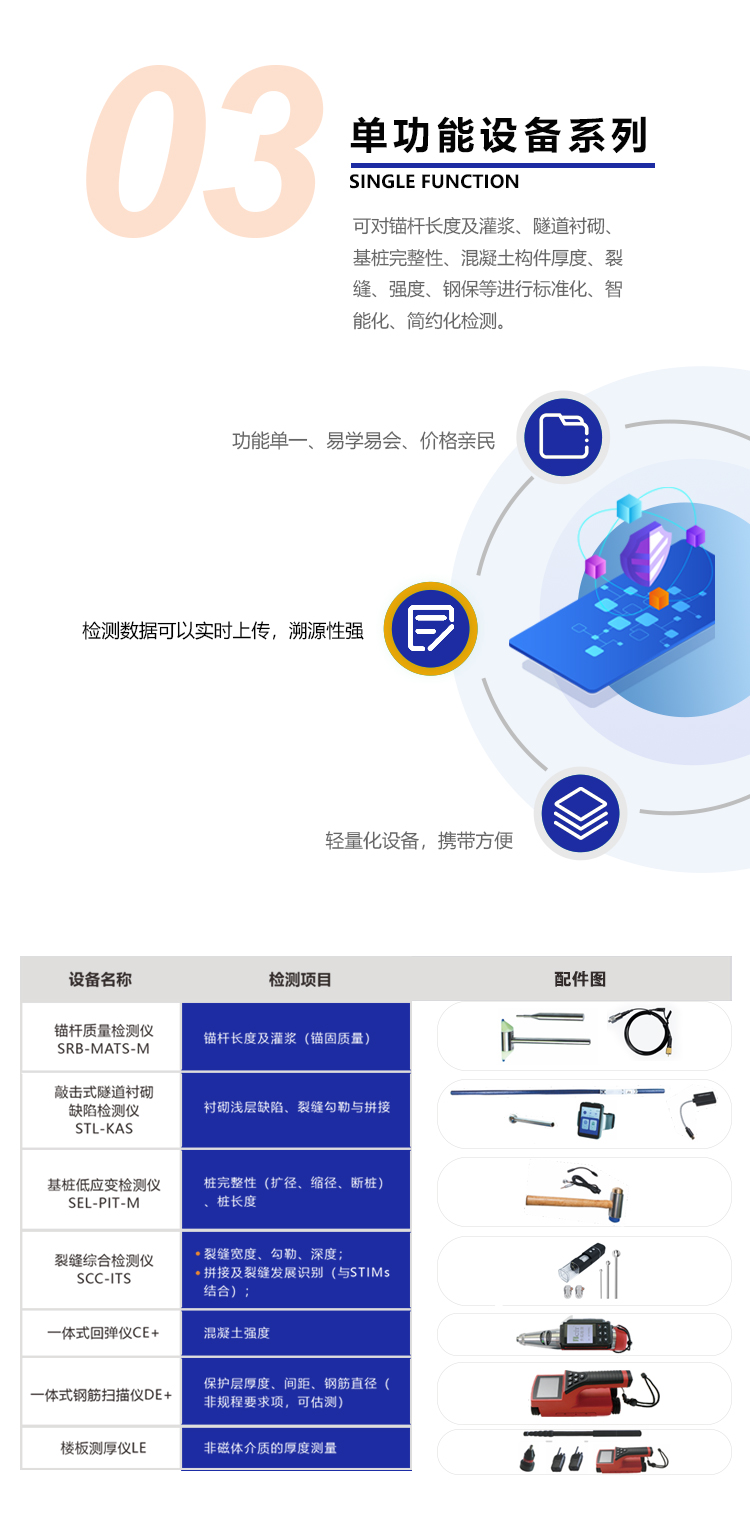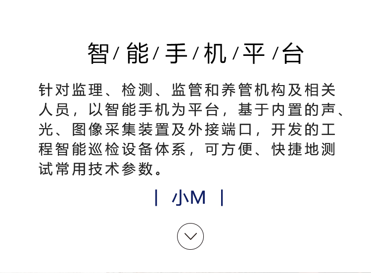 针对监理、检测、监管和养管机构及相关人员,以智能手机为平台,基于内置的声、光、图像采集装置及外接端口开发的工程智能巡检设备体系,可方便、快捷地测试常用技术参数。