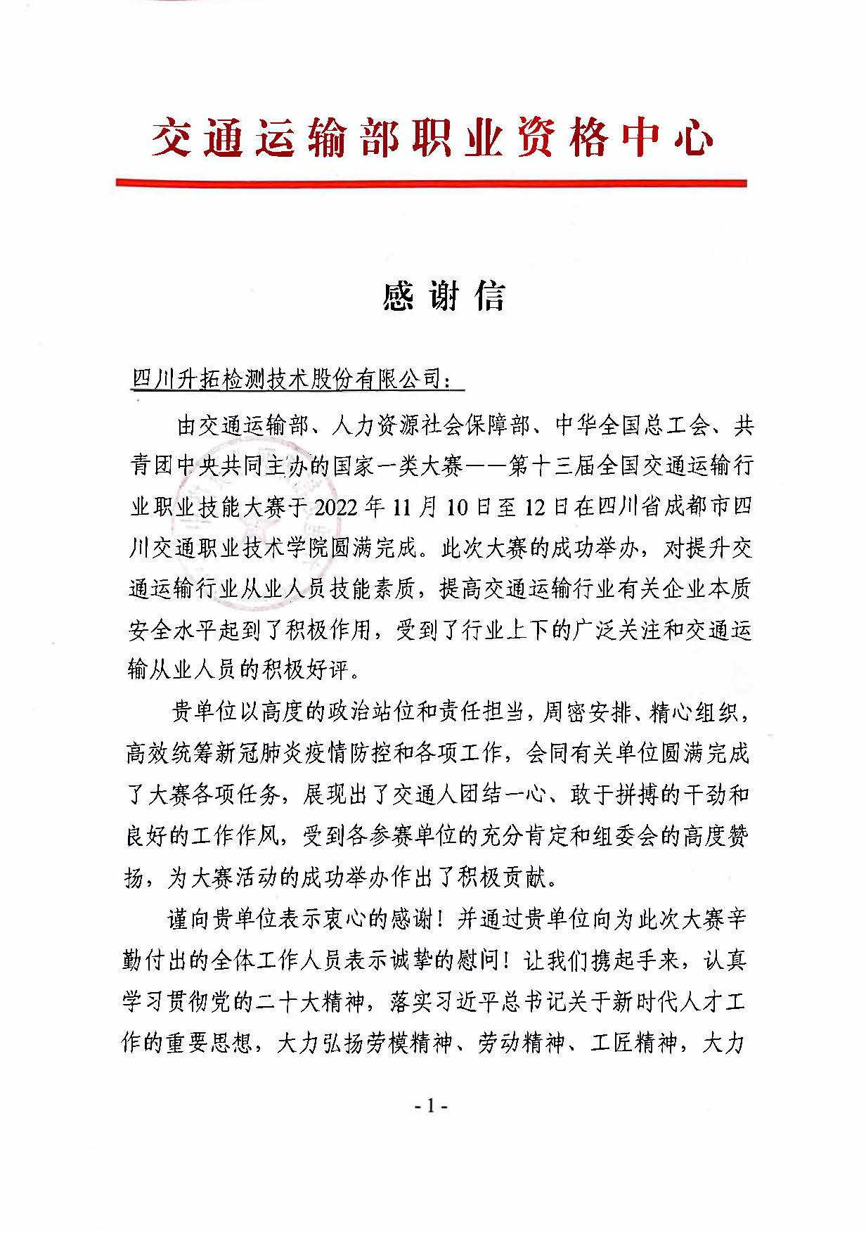 近日,四川升拓检测技术有限公司收到来自交通运输部职业资格中心的感谢信,信中对我公司在全国行业职业技能竞赛——第十三届全国交通运输行业职业技能大赛(国家一类大赛)筹备及举办期间高度的政治站位和责任担当,周密安排、精心组织,高效统筹新冠肺炎疫情防控和各项工作表达了衷心的感谢。这封527字的感谢信,也折射出升拓人的奋进精神与担当本色。