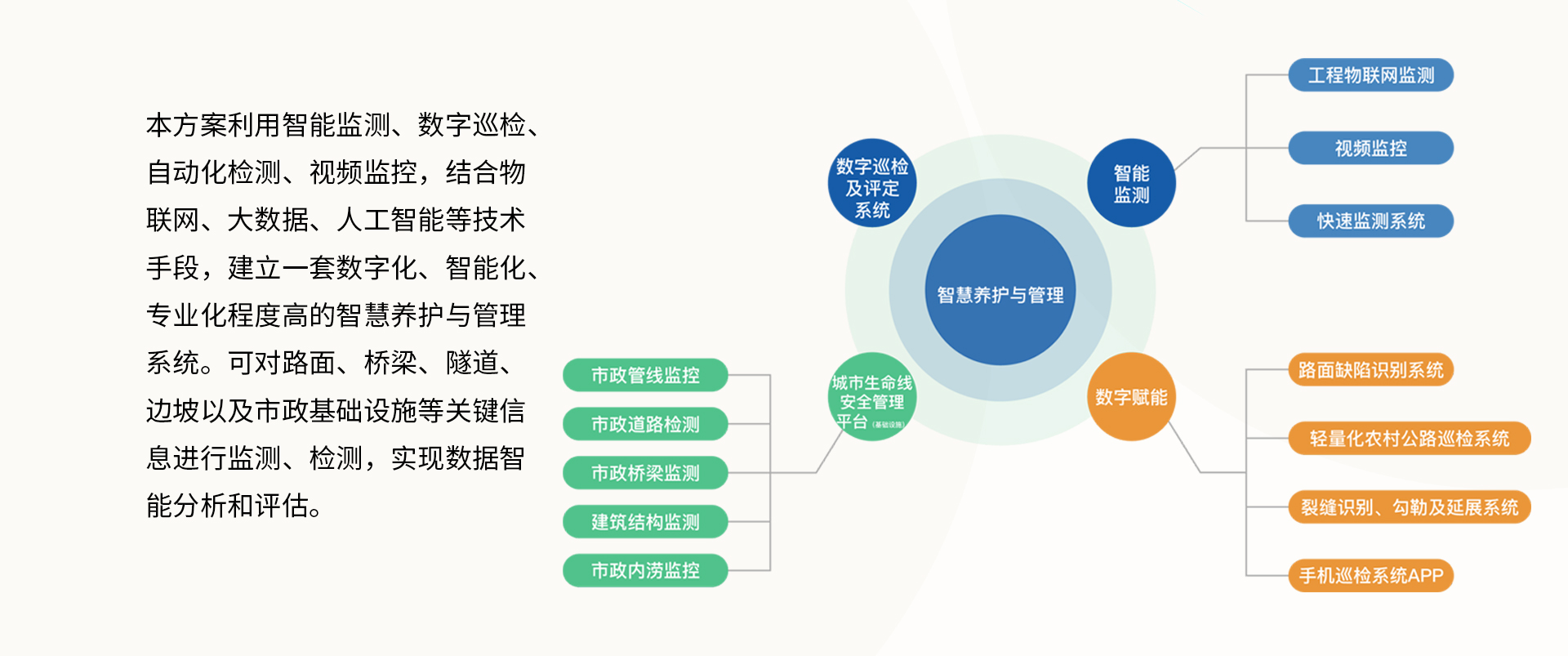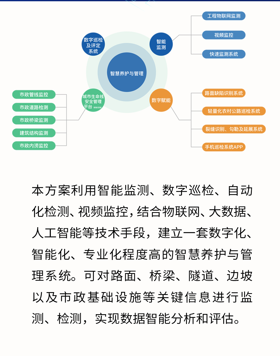 本方案利用智能监测、数字巡检、自动化检测、视频监控,结合物联网、大数据、人工智能等技术手段,建立一套数字化、智能化、专业化程度高的智慧养护与管理系统。可对路面、桥梁、隧道、边坡以及市政基础设施等关键信息进行监测、检测,实现数据智能分析和评估。